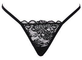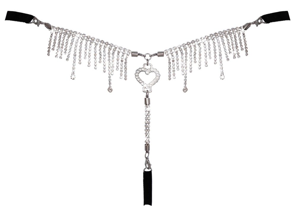 Luxuriöser, schwarzer String von Cottelli LINGERIE mit einer Front aus zarter weicher Spitze. Der hintere String-Teil ist aufwendig mit Strasssteinchen und -kettchen gearbeitet. Der opulente Schmuck mit dem grossem Strassherz in der Mitte ist (für die Handwäsche) komplett abnehmbar. Die seitlichen Stretchbänder am Bund sind passend verstellbar.