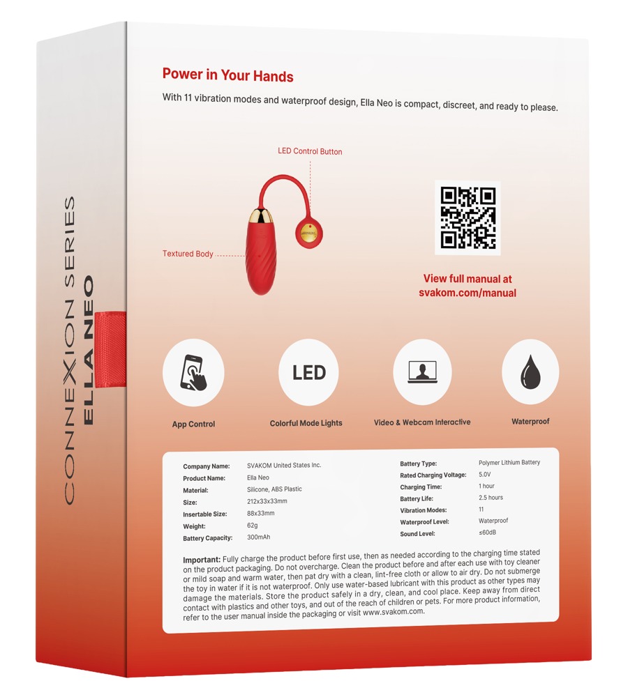 Wiederaufladbares, wasserdichtes Vibro-Ei für vaginale und anale Vergnügen. 11 leise, abwechslungsreiche Vibrationsmodi sind bequem am Ende des Rückholbandes steuerbar. Auch per SVAKOM-App (mit zusätzlichen Intensitäten und Überraschungsvibrationen) oder FeelConnect-3-App mit 3 neuen Hauptfunktionen: Long Distance Control (jederzeit von überall auf der Welt), Verbindung zu interaktiven 2D-Videos und interaktive Webcam-Funktion.