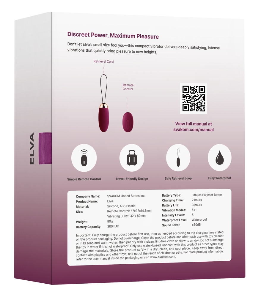 Inklusive Aufbewahrungsbeutel, USB-Ladekabel und Batterien für die Fernbedienung. Gesamtlänge 17,6 cm (inklusive Rückholband), Länge Vibro-Ei 8,1 cm, Ø 3,2 cm. Silikon mit PU-Beschichtung, ABS.